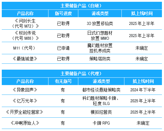 公司储备多款新品,,,,期待为玩家解锁更多新鲜体验,,部分产品如下表所示::::