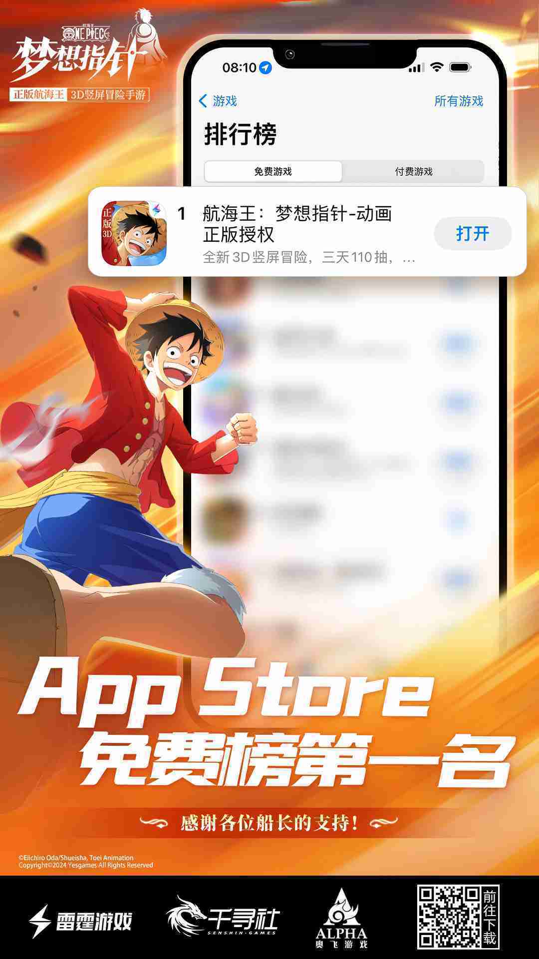 产品新闻 《航海王::::梦想指针》登顶App Store免费榜,,,公测福利汇总!!!